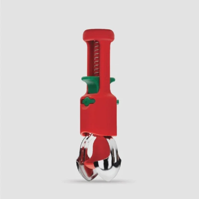 In one smooth action, Hullapit pits all sizes of cherries and olives with its spring-loaded plunger, catches their stones and pits, then releases them.