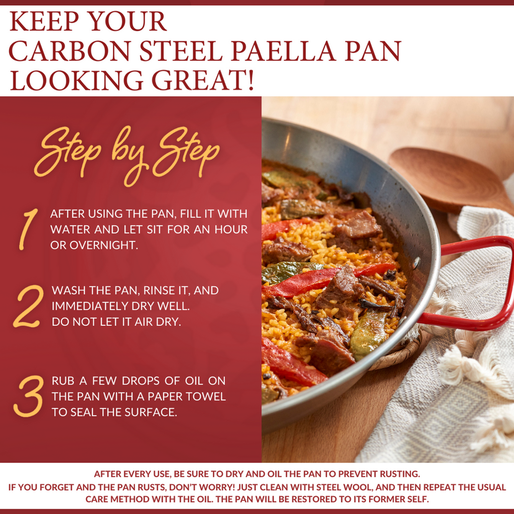 We include an informative pamphlet with each pan, which contains two recipes, our tips for perfect paella, and care instructions.